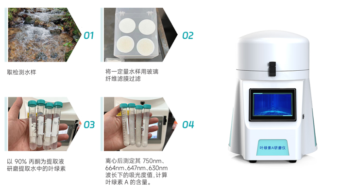將一定量樣品用濾膜過濾截留藻類,研磨破碎藻類細胞,用丙酮溶液提取葉綠素,離心分離后分別于750nm、664nm、647nm和630nm波長處測定提取液吸光度,根據(jù)公式計算水中葉綠素a的濃度。