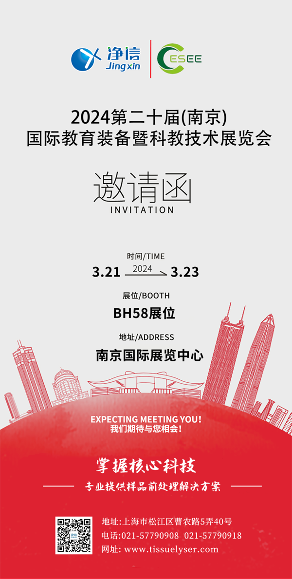 2024年3月21日至3月23日,第二十屆中國南京國際教育裝備暨科教技術(shù)展覽會,將會在南京國際展覽中心舉辦。上海凈信將攜多款新產(chǎn)品出席亮相,包括凈信科研者系列新品、超聲波設(shè)備、研磨設(shè)備等等。誠摯地邀請您前來BH58展位暢談商機(jī),共話樣品前處理的技術(shù)和應(yīng)用。