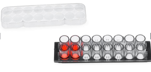 蓋玻片上的腔室共16個,分2排,各8孔(如圖示),每孔的內(nèi)直徑6mm。設(shè)計的每孔體積和孔距與標準96孔板的相同,無細胞毒性的硅膠孔墊片(silicone well gasket)與上層聚苯乙烯材料的腔室(the upper structure,厚0.5mm)和基層的硼硅酸鹽蓋玻片(the substructure,厚0.16-.19mm)形成滴水不漏的密封。有上層腔室時每孔體積250µl,去掉上層腔室后每孔體積9µl。